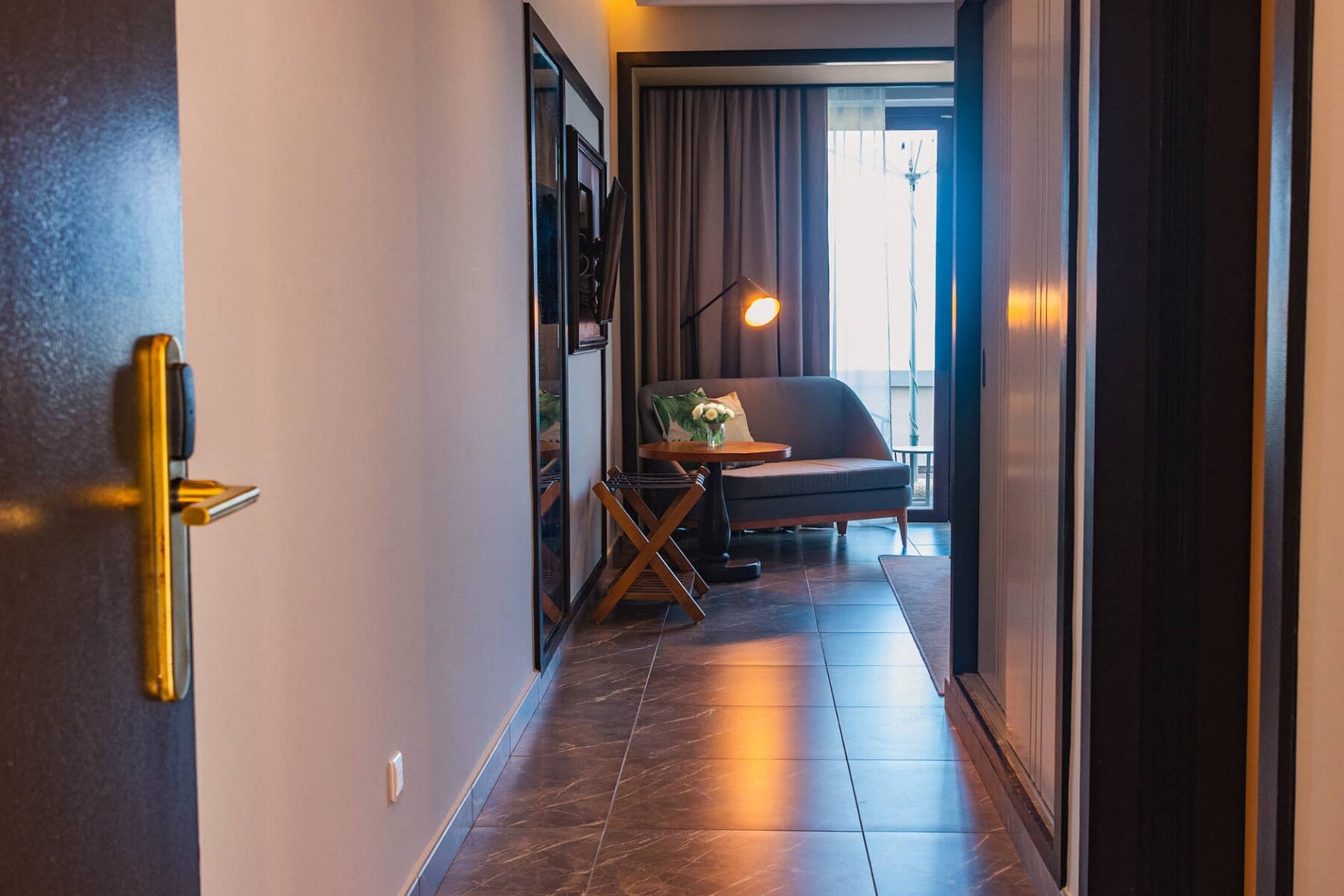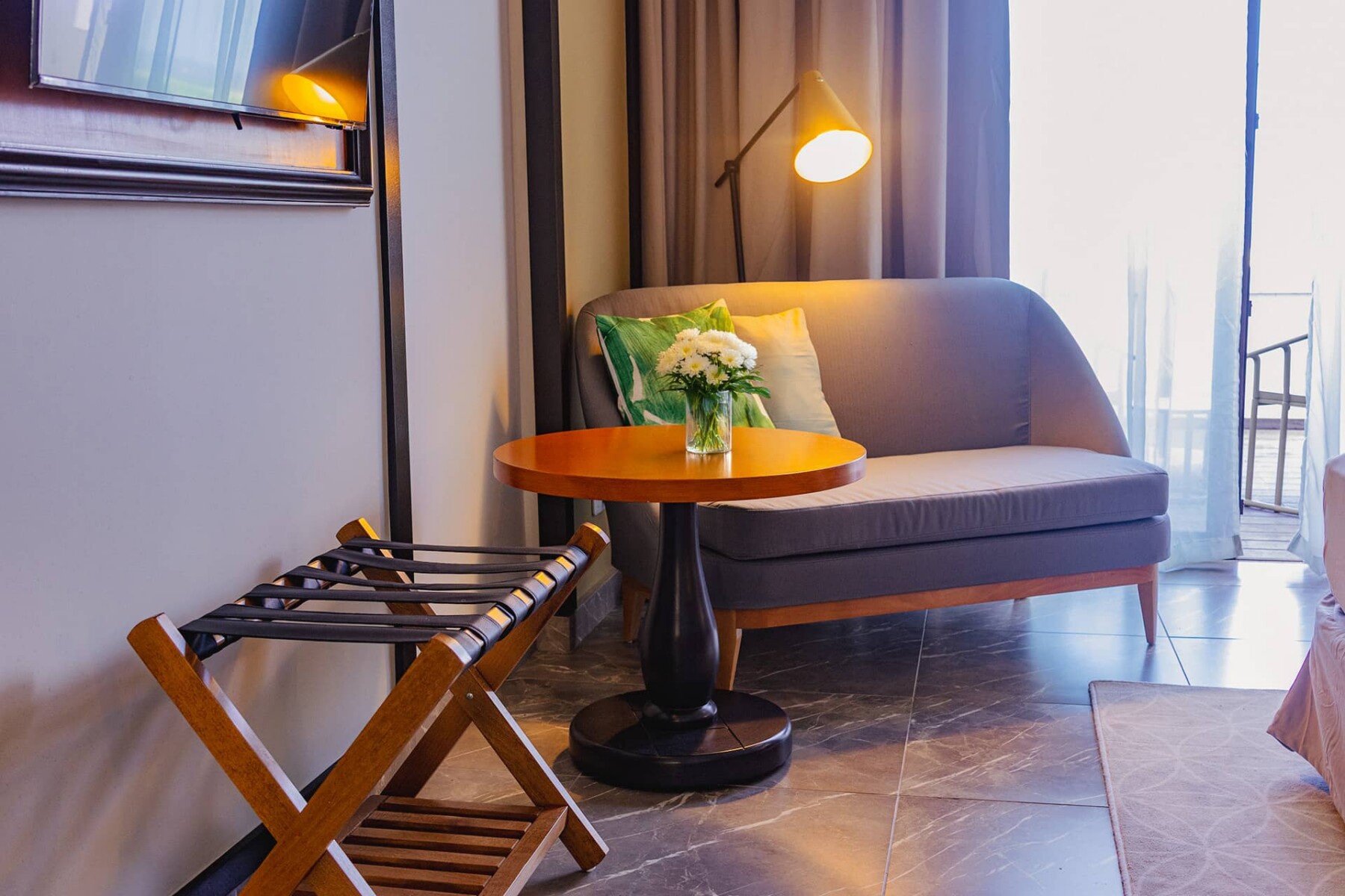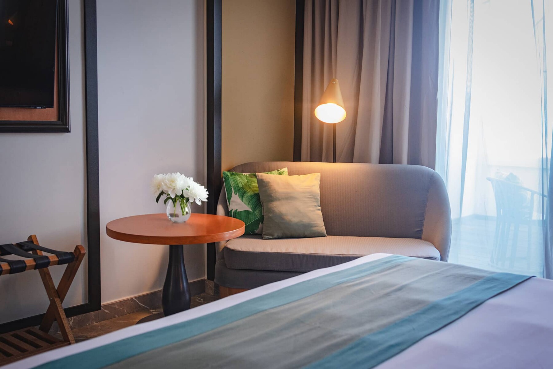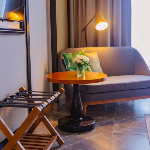 Cada habitación cuenta con una cama king-size, un cómodo sofá, una mesa de desayuno, caja fuerte y una selección de servicios modernos diseñados para su comodidad. Cada detalle ha sido cuidadosamente pensado para hacer que su estancia sea sencilla y relajante.